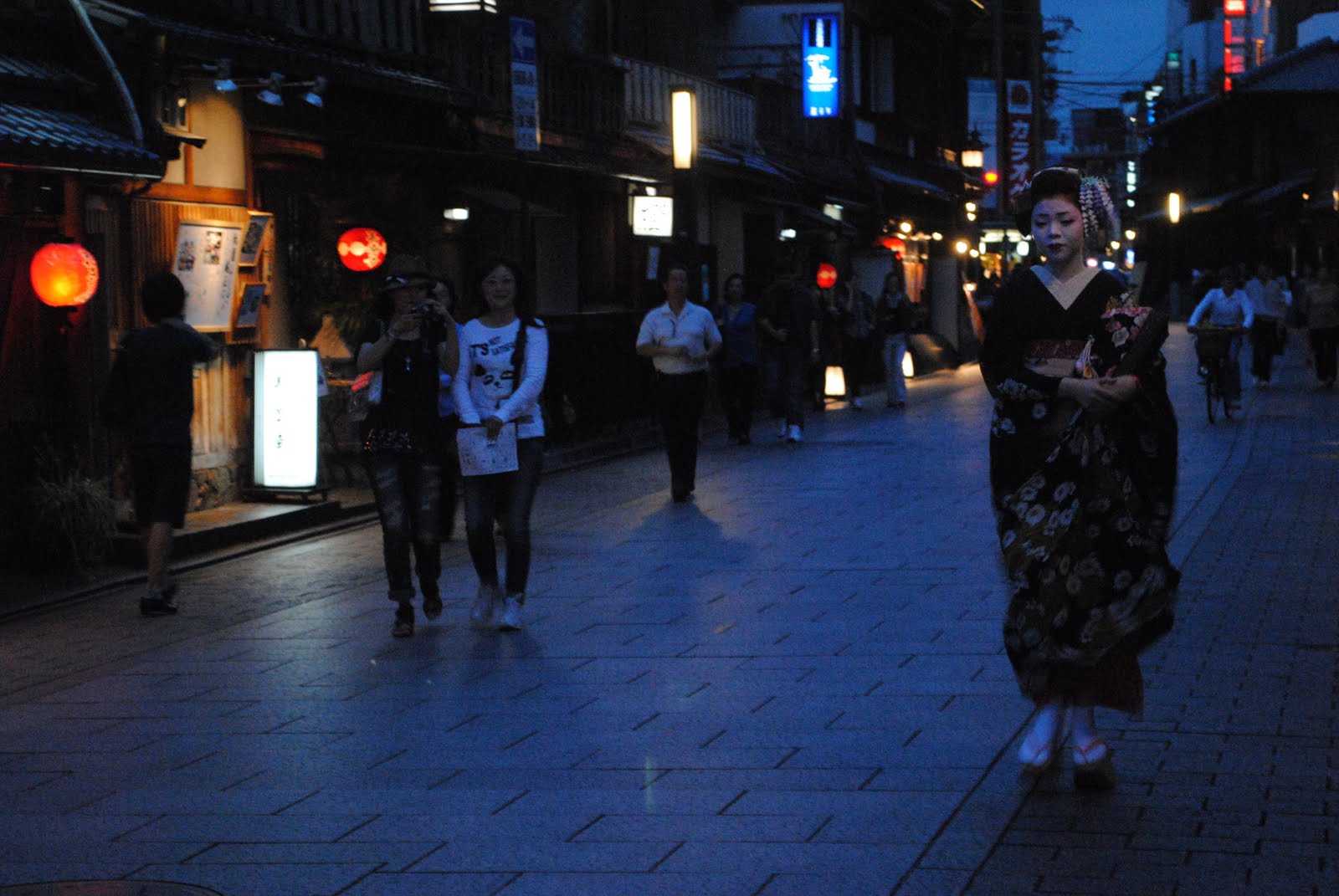 Maiko in Goin. I've always been interested in the old Geisha culture, i was a little disapointed. Not by the geiko and the maiko, i dident get to a preformance. and they did look breatyfull on the streets. But people are so rude to the geisha's tourists flashing their camera's right in their face. not asking for pictures but just running up to them. Its oke to take pictures i think, but holding your camera half a meter from their faces, using flash, not asking is just rude. I wouldent be albe to stand that!! Being jumped by rude tourists every day. They must feel like an attraction. When i asked a maiko she stopped and posed for me. But stupid me made a blurry picture (argh!)